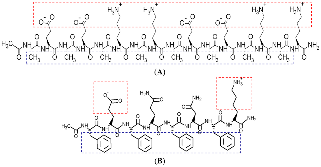 In our recent publications, we discussed a strategy for designing amino-acid-pairing peptides, and their potential for drug and gene delivery [,]. A short amino-acid-pairing peptide (AAP8), with a sequence of Ac-FEFQFNFK-NH2, was introduced and showed promise for delivering the anticancer drug Ellipticine. Despite its practicability in anticancer drug encapsulation, AAP8 shows uncontrollable aggregation, which is not favorable for many biological applications. Therefore, a DEG-functionalization procedure was explored as a strategy to improve the multi-functionality of the nanocarrier by avoiding aggregation and to enhance bioavailability of the drug delivery system []. The current work focuses on a new amino-acid-pairing peptide called EAR8-II for drug delivery. This peptide, like other ionic-complementary peptides, can spontaneously organize itself into a nano/micro structure that stabilizes hydrophobic therapeutic molecules and further facilitates passive targeting [,].Additional advantages of using such a peptide as a carrier for drug delivery are the ease with which it can be synthesized and functionalized to incorporate long circulation, active targeting, and low immunogenic properties []. In particular, EAR8-II has the benefit of two well-known amino-acid-pairing peptides, EAK16-II [] and AAP8 []. The design strategy exploits the ionic-complementarity of EAK16-II and the short sequence of AAP8. The shorter sequence of the peptide is the easier and less expensive synthesis procedure, and alternative charged residues in the sequence provide spontaneous self/co-assembly of the peptide with hydrophobic compounds such as Ellipticine and Pirarubicin (Figure 1).