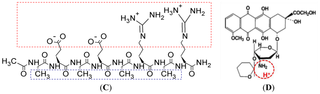 Molecular structure of (A) EAK16-II (Ac-AEAEAKAKAEAEAKAK-NH2) []; (B) AAP8 (Ac-FEFQFNFK-NH2) []; (C) EAR8-II (Ac-AEAEARAR-NH2). The red and blue box regions indicate the charged and hydrophobic residues, respectively. E: Glutamic acid (Glu); A: Alanine (Ala); K: Lysine (Lys); R: Arginine (Arg), F: Phenylalanine (Phe); Q: Glutamine (Glu); N: Asparagine (Asn); and (D): Pirarubicin (THP) [].