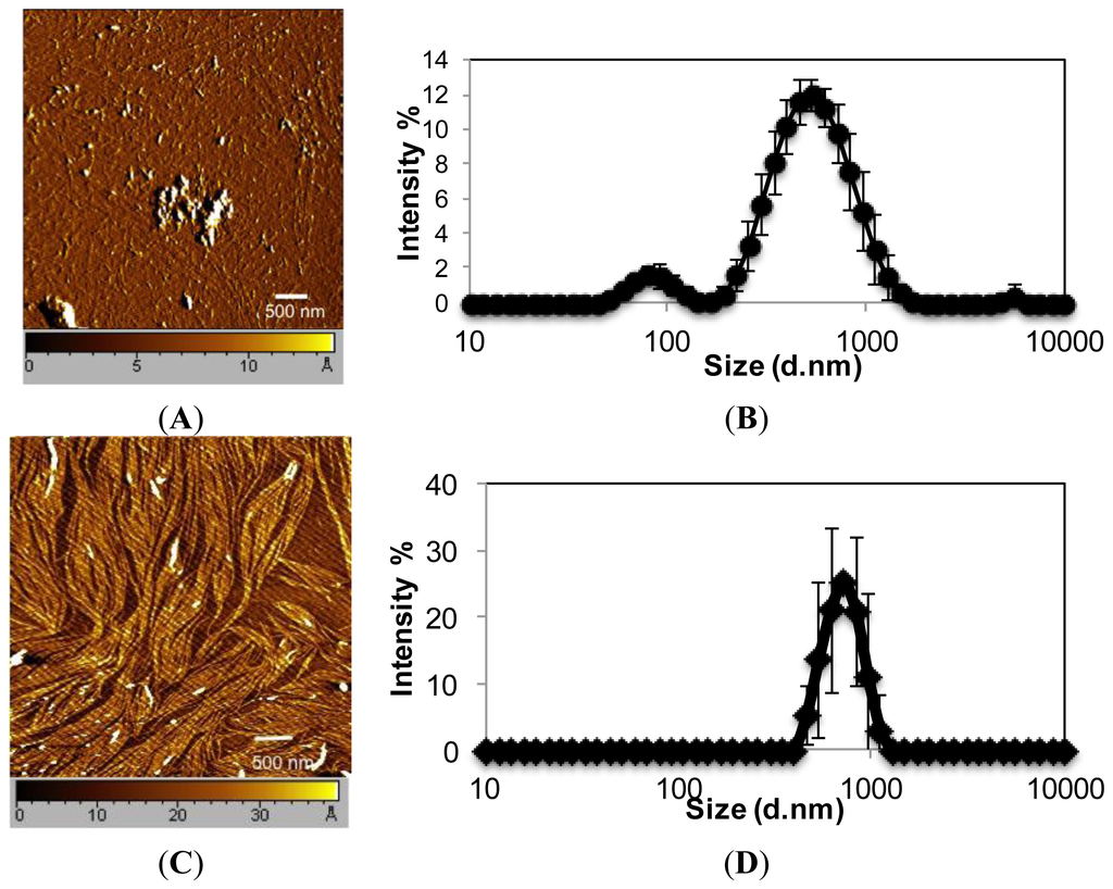 Nanostructure of (A) EAR8-II and (C) EAR8-II-THP complex by tapping mode atomic force microscopy; Intensity-based particle size distribution of (B) EAR8-II and (D) EAR8-II-THP complex in aqueous solution by dynamic light scattering. EAR8-II concentration is 0.5 mg/mL, and THP concentration is 0.1 mg/mL.