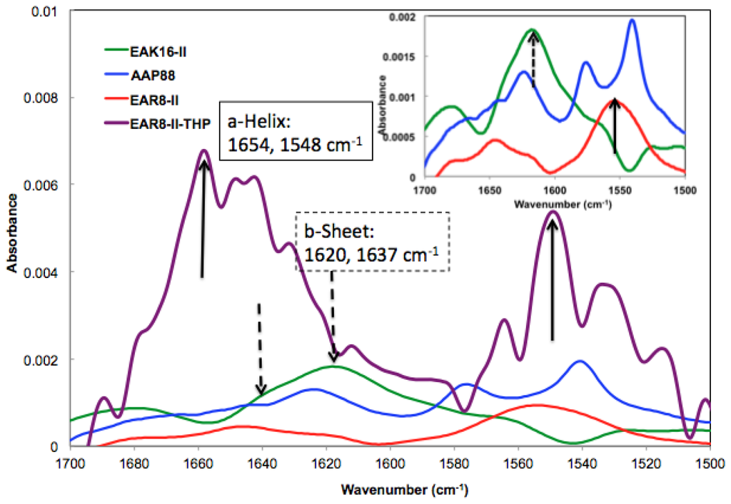 The absorbance peaks from the FT-IR spectrum at 1614–1622 and 1630–1637 cm−1 correspond to β-sheets, and peaks at 1650–1658 and 1548 cm−1 correspond to α-helical secondary structures. As shown in Figure 3, EAK16-II formed β-sheets dominantly, and AAP8 formed a mixture of β-sheets and α-helices. However, EAR8-II showed stronger formation of α-helical structures than the other two self-assembling peptides, probably due to the length of peptide, because intramolecular interactions causing a helical structure in short sequences are stronger than the ones in longer sequences. The FT-IR spectrum collected from the complex containing EAR8-II and THP illustrated a significant increase in absorption intensity at wavenumbers corresponding to α-helical secondary (1654 and 1548 cm−1) structures, compared to the spectrum collected from the peptide solution. The higher absorption intensity in the FT-IR spectrum implies higher amounts of corresponding secondary structures. The helical fibular bundle structures formed in EAR8-II-THP complexes demonstrate the strong interactions between the peptide and drug to form an organized nanostructure.
