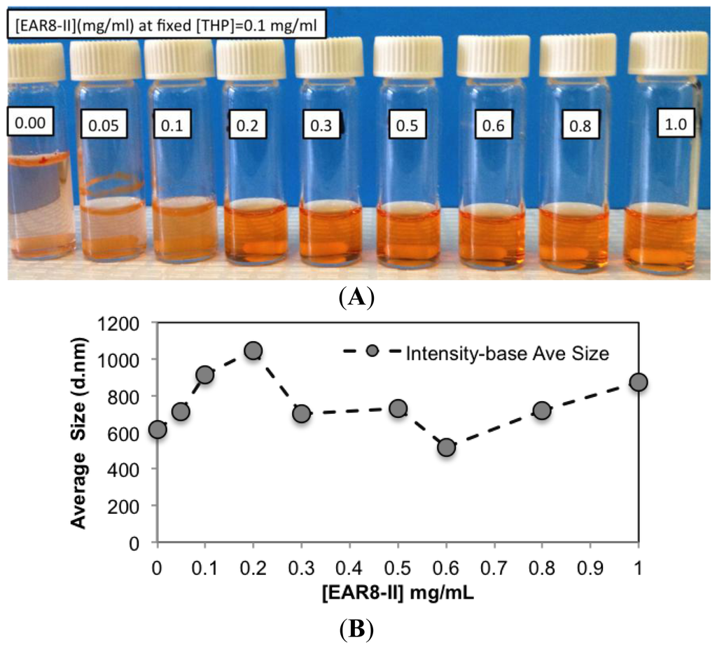 (A) Appearance of complexes formed by EAR8-II and THP and different EAR8-II:THP mass ratios. (From left to right: THP in water, 1:2, 1:1, 2:1, 3:1, 5:1, 6:1, 8:1, 10:1 mass ratios); (B) Intensity-base average hydrodynamic diameter of EAR8-II-THP complexes at fixed [THP] = 0.1 mg/mL.
