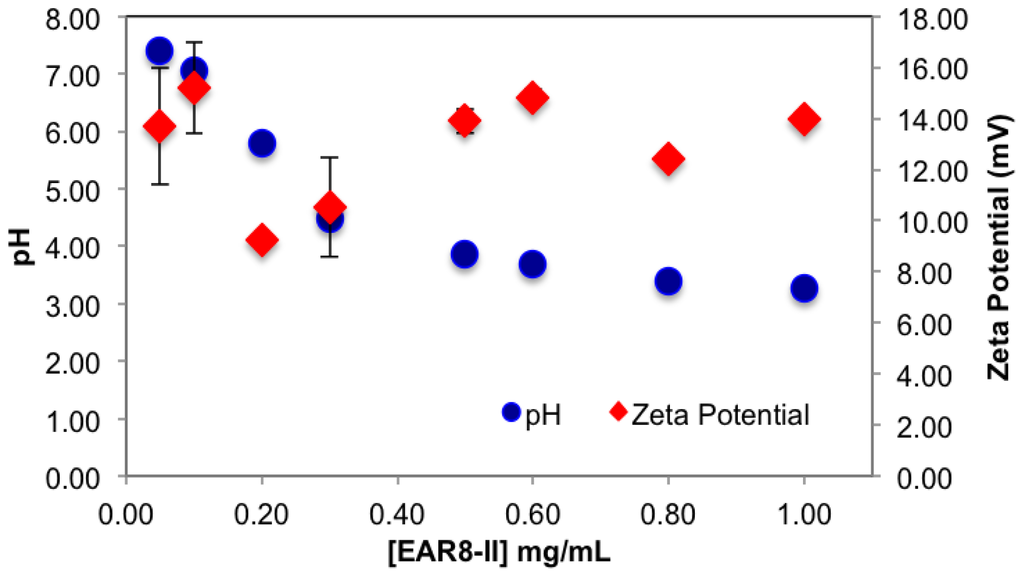 Zeta potential and pH of complex at fixed [THP] = 0.1 mg/mL and varied [EAR8-II].