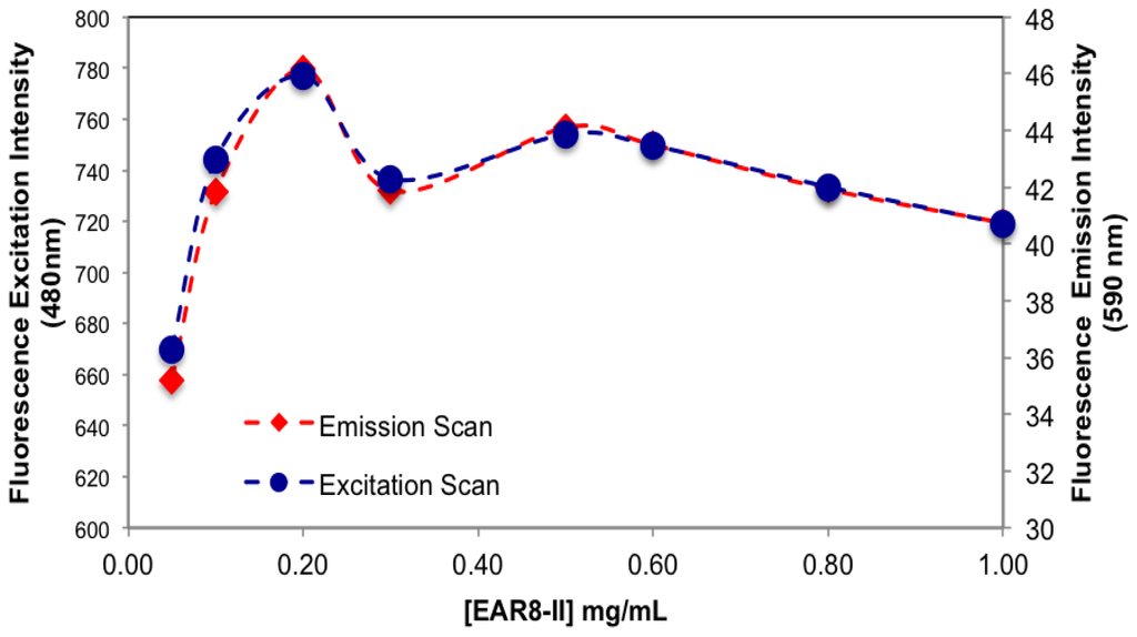 The amount of protonated THP in EAR8-II is also determined by measuring the fluorescence intensity of the excitation and emission by THP at different EAR8-II concentrations. Protonated THP absorbs light at 480 nm, and emits light at 590–600 nm. Fluorescence intensity for both the excitation and emission spectra is proportional to the concentration of protonated THP stabilized in the peptide solution. Although the initial concentration of THP was constant in each complex, the amount of protonated THP varied due to the dependency of the THP encapsulation efficiency on peptide concentration. As shown in Figure 6, when peptide concentration increased, the THP fluorescence intensities increased, and plateaued at peptide concentrations above 0.5 mg/mL. At lower peptide concentrations, substantial amounts of non-stabilized THP were present in the solutions, and the fluorescence intensities were significantly low, whereas at higher peptide concentrations where all the THP molecules were stabilized in the peptide aqueous environment, higher fluorescence intensities were collected. Our results showed that the minimum concentration of peptides required to fully encapsulate THP was ~0.5 mg/mL.
