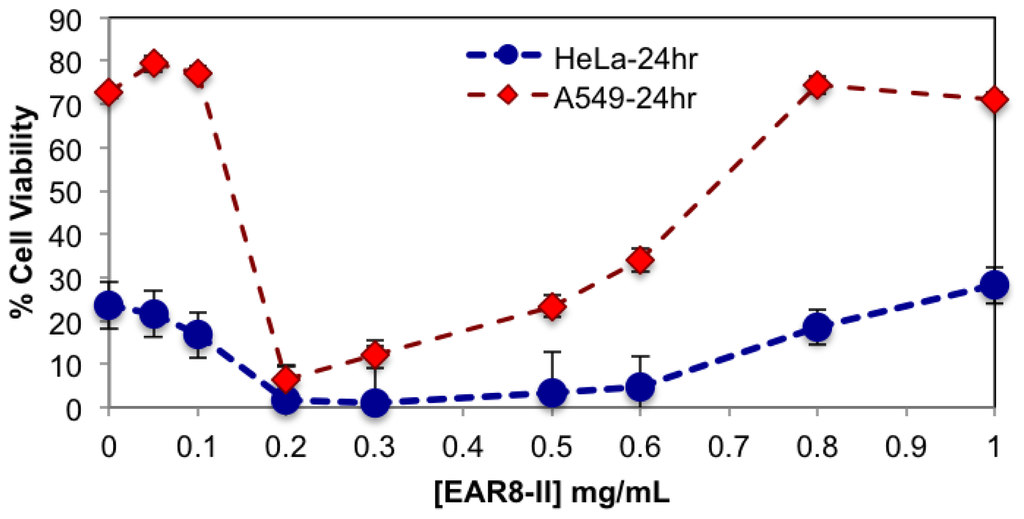 Viability of A549, HeLa cells treated with serially diluted complexes at 5:1 EAR8-II to THP complex for 24 h.