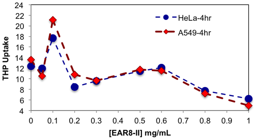 It is speculated that protonated THP molecules were inclined to interact with negatively charged cell membrane and promoted cellular uptake. The hydrophobic properties of THP further stimulated molecules cross the cell membrane and localized in the cytoplasm. As shown in Figure 8, cellular uptake of complexes with a peptide concentration between 0.3 and 0.6 mg/mL presented higher cellular uptake for both cell lines than the complexes beyond that ratio. The exception was the peptide-to-drug ratio 1 to 1 and the THP control, showing dramatically high uptake due to accumulation of free THP molecules on the cell membrane without them being fully localized in the cytoplasm. On the other hand, the complexes with higher EAR8-II concentrations (0.8–1.0 mg/mL) showed significantly lower cellular uptake due to highly bound EAR8-II to THP and inhibiting release of hydrophobic THP to the cell membranes.