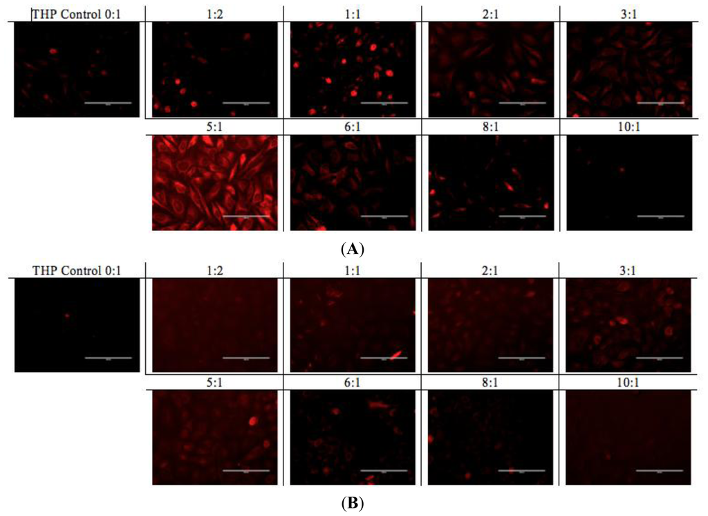 (A) HeLa cells; (B) A549 cells, treated with EAR8-II-THP at fixed [THP] = 0.1 mg/mL and varied [EAR8-II]. The ratios between EAR8-II to THP are indicated above each image. EAR8-II concentrations: (0:1) = 0.0 mg/mL; (1:2) = 0.05 mg/mL; (1:1) = 0.1 mg/mL; (2:1) = 0.2 mg/mL; (3:1) = 0.3 mg/mL; (5:1) = 0.5 mg/mL; (6:1) = 0.6 mg/mL; (8:1) = 0.8 mg/mL; (10:1) = 1.0 mg/mL. Scale bar is 100 μm.