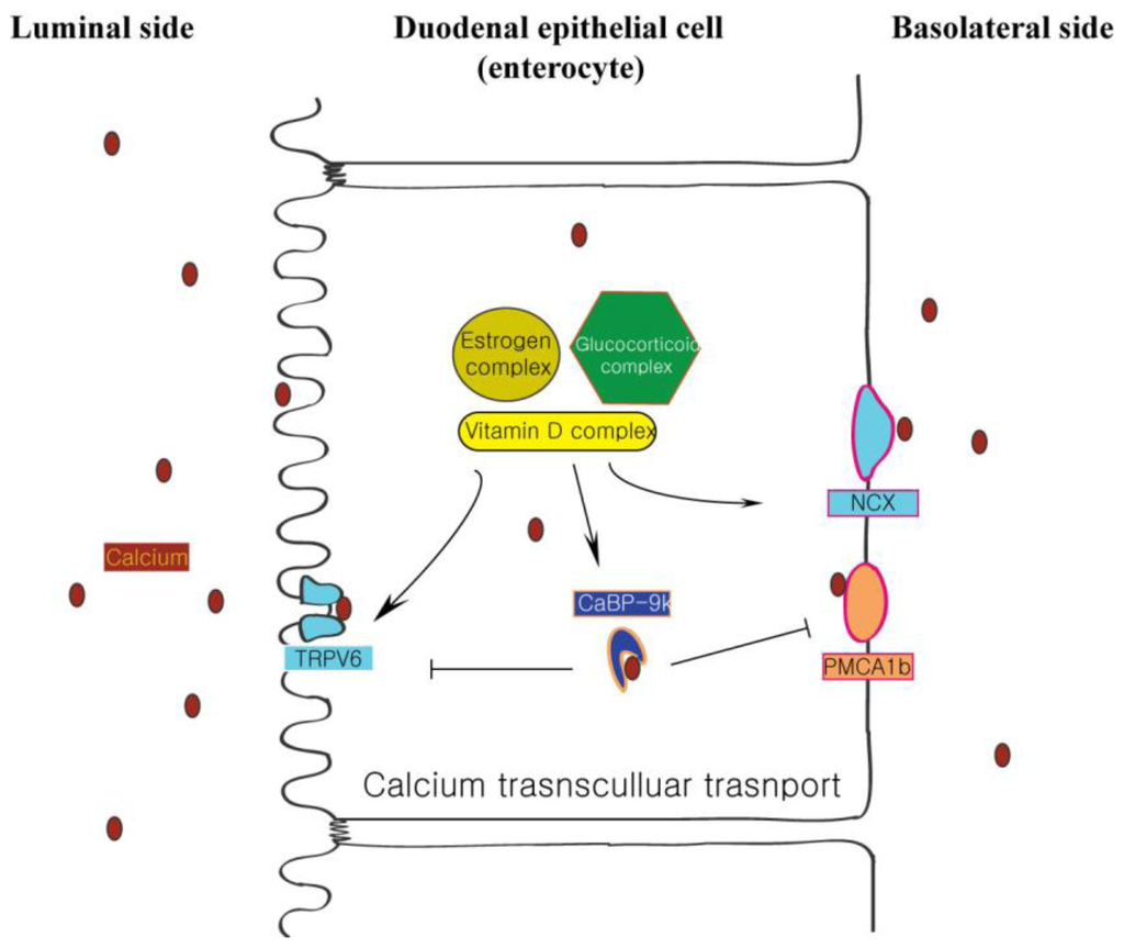 Calcium homeostasis refers to the regulation of the concentration of calcium ions in the body, and impairment of this mechanism contributes to their underlying pathologies, such as hypercalcemia or hypocalcemia. When calcium is absorbed in the intestine along either transcellular or paracellular routes, the transcellular transport of calcium ion occurred mainly in the upper intestine including the duodenum and upper jejunum. As a component of active transcelluar trasnport process, CaBP-9k (S100G in human) was originally described as a vitamin D-dependent calcium-binding protein in the intestine [1], and it binds intracellular calcium with high affinity in the cytoplasm [2]. In addition, there is evidence that CaBP-9k regulates the level of intracellular free calcium in order to prevent this mineral from reaching toxic levels [3]. Traditionally, it was thought that intracellular binding proteins transfer cytosolic calcium from the apical membrane to the basolateral membrane via trans-cellular transport of calcium [4], while calcium entry is facilitated by apical transient receptor potential vanilloid 6 (TRPV6), and calcium export is promoted by plasma membrane Ca2+-ATPase 1b (PMCA1b) as shown in Figure 1. PMCA1b facilitates the excretion of calcium ions using adenosine triphosphate (ATP) hydrolysis [5]. Like PMCA1b, NCX1 exchanges outer sodium ions for inner calcium ions [6,7]. In order to understand the influence of CaBP-9k related to other calcium related proteins, we focused our attention on the expression and function of CaBP-9k within duodenal epithelial cells.