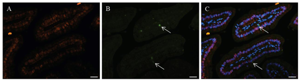 The duodenum is the first part of the small intestine in which digested nutrients are absorbed by the epithelial layer. Although the jejunum and ileum are also other sites of dietary calcium absorption via paracellular absorption [8,9], the presence of calcium-related proteins in duodenal epithelial cells also promotes uptake of calcium across the epithelium and its transport into the blood stream via transcellular absorption. We have previously shown that in the porcine intestine CaBP-9k is highly expressed in the duodenum. CaBP-9k expression decreases gradually aborally to undetectable in the distal ileum [10]. In the intestinal epithelium, three differentiated types of cells along the villus are organized with enterocytes, goblet cells, and enteroendocrine cells [11]. As intestinal absorptive cells, enterocytes are terminally differentiated cells comprising the majority of the intestinal epithelium. To further define which epithelial cell types within the duodenum express CaBP-9k, we examined in our unpublished study the duodenum of mice by double-label immuno-histochemical studies with anti-mouse CaBP-9k antibody and antibody directed against chromogranin A (enteroendocrine cell marker) or E-cadhedrin (epithelial cell maker). As previously reported for enterocyte [12], immune-reactive CaBP-9k presents in the majority of the intestinal epithelium as shown in Figure 2, and this suggest that mouse CaBP-9k in the duodenum might be confined to enterocytes, the major population of duodenal epithelial cells, because other cell types in the epithelium are present in 2%–3% population of epithelial cells in the villus.