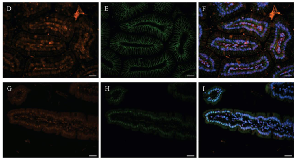 Immuno-histochemical analyses in duodenal villi of mice. A to F, immunoreactive CaBP-9k appears in the cytoplasm of many populations of epithelial cells within the duodenal villi (A and D, red) at 100× magnification by immunofluorescence detection. To identify the co-localization between CaBP-9k and other proteins, the specific antibodies for chromogranin A (B, green) and E-cadhedrin (E, green) were co-incubated with anti-mouse CaBP-9k antibodies using corresponding Alexa-Fluor conjugated secondary antibodies. DAPI (blue) was used for nuclei staining. Based on DAPI signals, co-localization of CaBP-9k and each protein is evident by superimposition (C and F) of the green and red signals, respectively. HNF-4α (nuclear protein marker, G, Red) used in an attempt to identify the GR (H, green) expression in duodenal enterocytes, both images were merged and observed as blue (I). Scale bar = 20 μm.