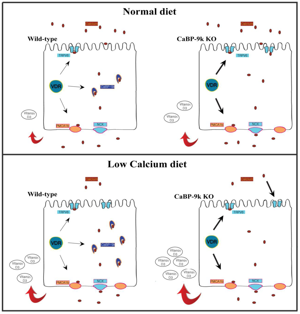 The role of CaBP-9k in the extracellular and intracellular environment of enterocytes. In calcium absorption, the abolishment of intracellular CaBP-9k stimulates compensative increase of vitamin D, and the increased vitamin D induces the expression of apical or basolateral membrane bound channels. In addition, a low calcium diet may also stimulate the expression of membrane bound channels in CaBP-9k knockout mice.
