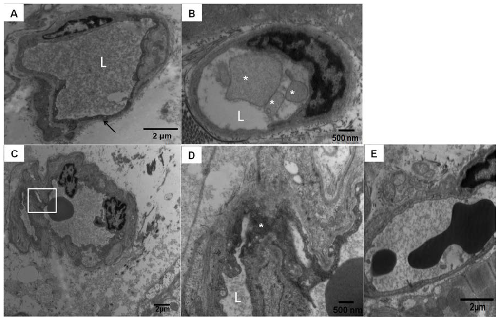 Mexico City dogs myocardial blood vessel pathology. (A) Scattered left and right ventricle capillaries exhibited endothelial cells with very dark cytoplasm, shrinkage, and partial detachment from the vessel lumen. This picture corresponds to a 4.6 years South MCMA animal facility male dog. “L” is marking the vessel lumen, magnification ×14,500; (B) South MCMA female dog with membranous luminal fragmented material in the vessel lumen (white *), magnification ×29,100; (C,D) correspond to a male 5 years old dog with numerous fine and ultrafine particulated material in the arteriolar wall (square), magnification ×7290; At ×29,100 (D), the conglomerates de PM are occupying the endothelial cytoplasmic space (white *); and (E) Normal left ventricle capillary in a 5 years old control dog, magnification ×14,500.