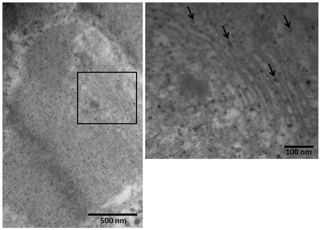 The endoplasmic reticulum (ER), a network of membranes responsible for secreted and membrane protein synthesis, protein processing, protein folding and lipid biosynthesis is a highly dynamic organelle with physical connection with mitochondria in cardiac myocytes [,]. The myocardial ER in Mexico City dogs showed the presence of nanosized particles in both left and right ventricles (Figure 4).