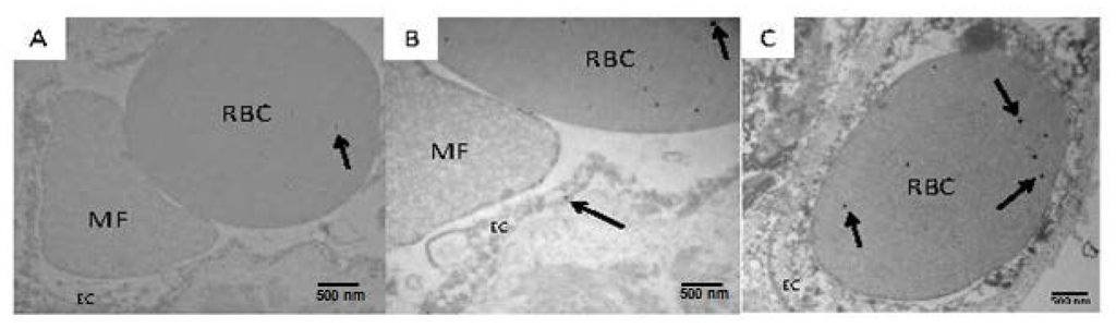 Although the electron microscopic material obtained from human autopsies was not optimal, we were able to identify nano particles in luminal erythrocytes in myocardial capillaries (Figure 5).