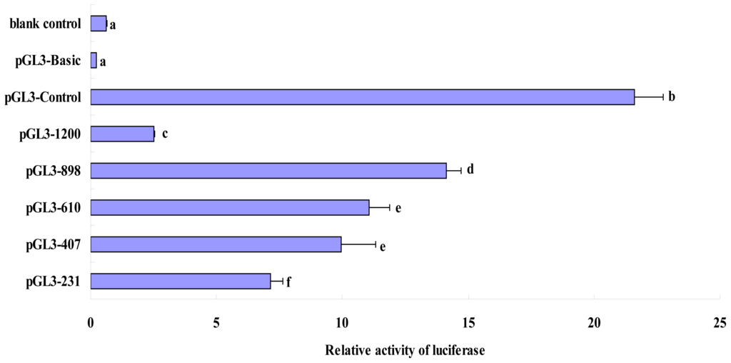 Differences in the promoter activity between pGL3-610 and pGL3-407 were not significant; however, the differences in other groups were significant (Figure 3). Of these, promoter activity of pGL3-898 was the highest (14.124 ± 0.605) and that of pGL3-1200 was the lowest (2.509 ± 0.035), indicating that the deletion in the pGL3-898 plasmid included a key cis-acting element that functioned in negative regulation. The promoter activities decreased in the order pGL3-610 (11.050 ± 0.817), pGL3-407 (9.968 ± 1.349), and pGL3-231 (7.132 ± 0.520), indicating that the deleted regions played a role in positive regulation (Figure 3).