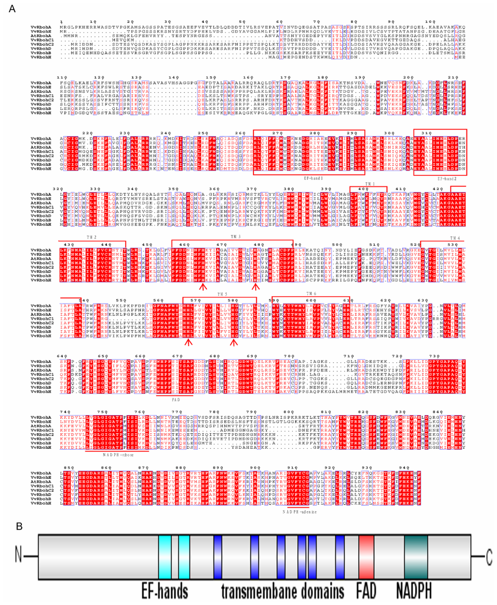 Protein alignment and domain structure of AtRbohA and the seven predicted grape respiratory burst oxidase homolog (Rboh) proteins. (A) The red shading indicates residues that are identical and the lighter shading represents positions with a lower level of conservation. EF-hand domains are indicated by the boxes. Conserved binding sites for flavin adenine dinucleotide (FAD), NADPH-ribose and NADPH-adenine are indicated with a straight line below the alignment. Histidine residues involved in heme binding are indicated by arrows. Putative transmembrane domains (TMs) are indicated by brackets above the alignment; and (B) Schematic representation of the grape Rboh proteins with their respective functional domains, showing that grape Rboh proteins are similar to Arabidopsis AtRbohA.