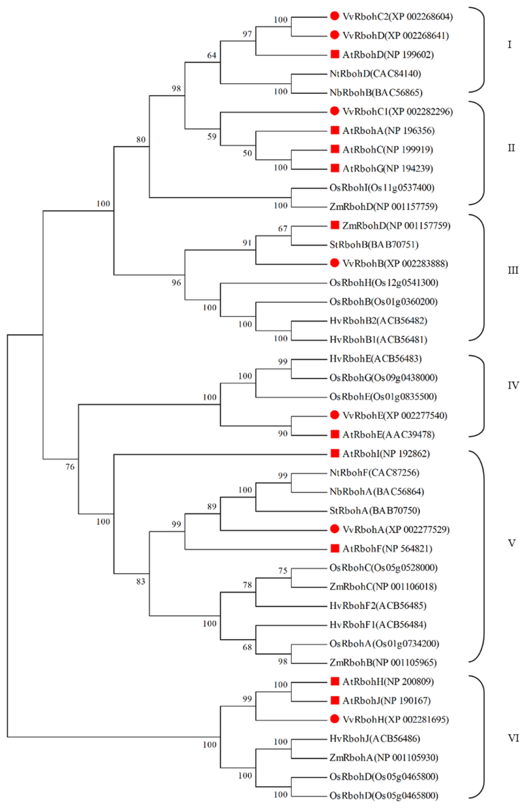 Phylogenetic analysis of grape and other plant Rboh proteins. The phylogenetic tree was constructed with Rboh domain protein sequences from V. vinifera (VvRboh), N. tabacum (NtRboh), Z. mays (ZmRboh), O. sativa (OsRboh), A. thaliana (AtRboh), S. tuberosum (StRboh), N. benthamiana (NbRboh) and H. vulgare (HvRboh). They were classified to six groups: I, II, III, IV, V, VI. VvRboh proteins are indicated with red circles and AtRboh proteins with red boxes. All accession numbers or locus IDs of the rboh genes are listed in the phylogenetic tree.