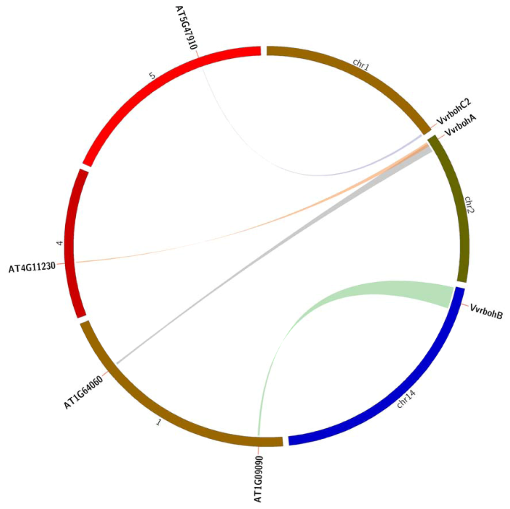 Synteny analysis of rboh genes from grape and Arabidopsis. The positions of related Vvrboh genes and Atrboh genes are depicted in the grape chromosomes (chr1, 2 and 14) and Arabidopsis chromosomes (1, 4 and 5), respectively. Colored lines connecting two chromosomal regions indicate syntenic regions between grape and Arabidopsis chromosomes.