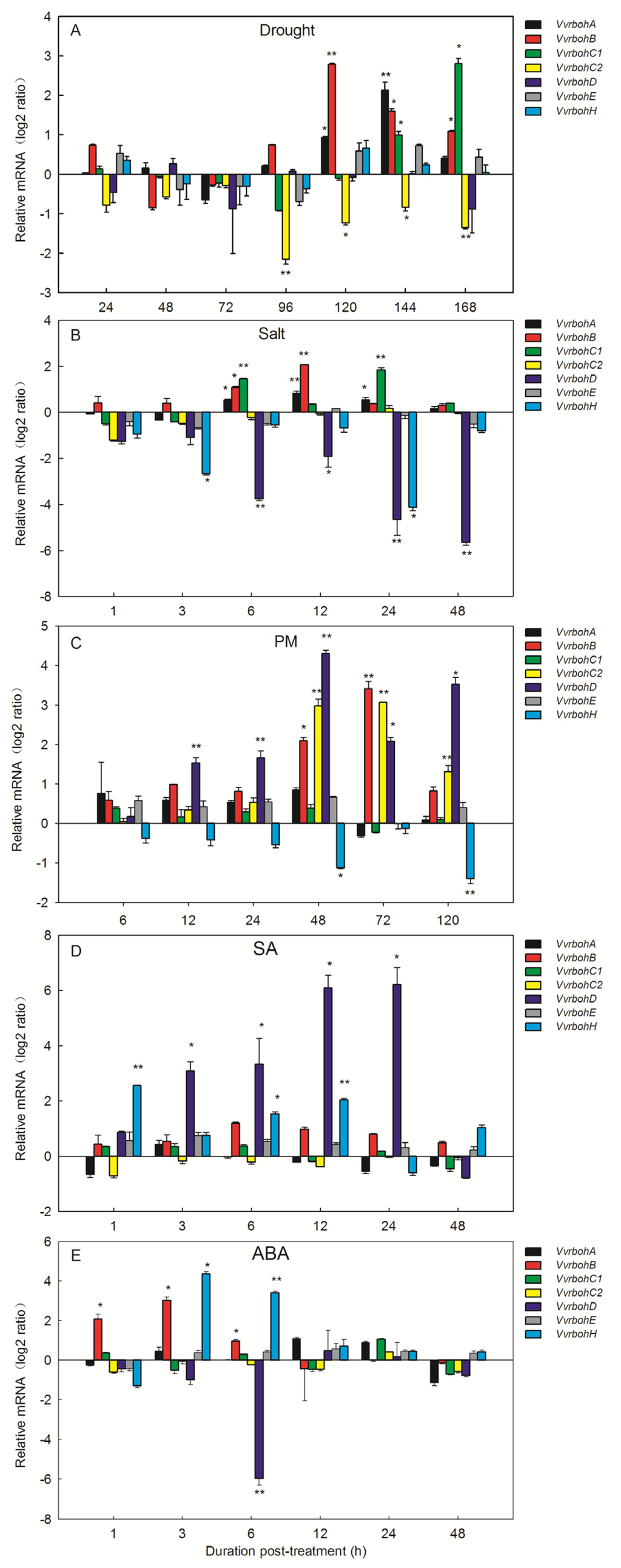 In order to determine whether the Vvrboh genes responded to stress conditions, we examined their expression patterns in response to a series of stress and exogenous hormone treatments. To test abiotic stress effects, drought and salinity treatments were performed. As shown in Figure 6A,B, the expression levels of VvrbohA, VvrbohB and VvrbohC1 were significantly increased by salt and drought treatments, while VvrbohC2 was down-regulated under drought treatment. Only the transcripts of VvrbohD and VvrbohH were down-regulated by the salt treatment, while VvrbohE expression was not altered by either treatment.