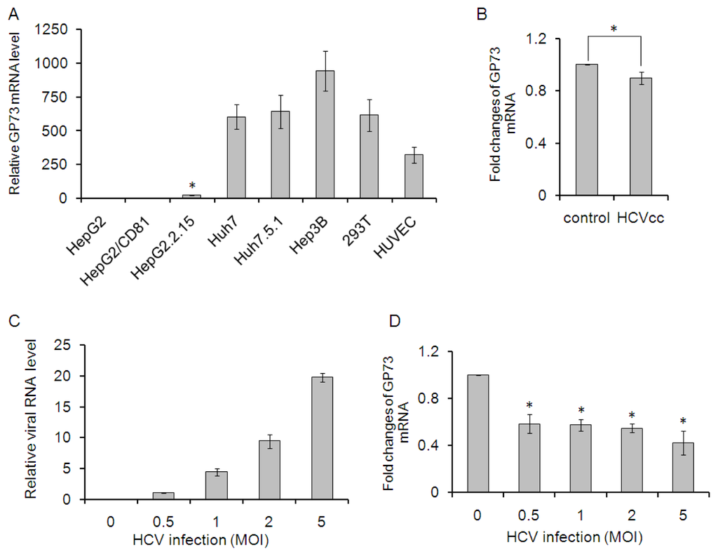 Kladney et al. reported that GP73 was present at high levels in HepG2.2.15 cells (a cell line that supports active HBV replication), but was absent in HepG2T14.1 cells (an HBV-transfected cell line that does not support HBV replication) and in HBV-free HepG2 cells [14]. To further clarify the expression of GP73 in different cell lines, the mRNA levels of GP73 in a serial of cells compared to that in HepG2 cells were detected through real time PCR. As shown in Figure 1A, HepG2/CD81 had a comparable level of GP73 to HepG2 cells. The mRNA level of GP73 in HepG2.2.15 was about 25-fold than that in HepG2 cells (p < 0.05). Huh7, Huh7.5.1, Hep3B, 293T and HUVEC cells showed dramatically higher levels of GP73, approximately 300 to 900 folds than that in HepG2 cells. To identify the effects of HCV infection on GP73 expression, GP73 mRNA level was detected in Huh7 cells 24 h after HCV infection. The mRNA levels of GP73 in HCV infected Huh7 cells were slightly down regulated (Figure 1B). HepG2 cells have been previously shown to support HCV cell entry if the missing receptor, CD81, is overexpressed [16]. Here, we labelled the HepG2 cells with overexpressed CD81 as HepG2/CD81. Similar results, that GP73 was down-regulated by HCV infection, were observed in HepG2/CD81 cells. The mRNA level of GP73 was reduced by about 50% in HepG2/CD81 cells with different doses of HCV infection. These results indicate that GP73 mRNA levels, either in cells with low level (HepG2/CD81) or high level (Huh7) of GP73, are down-regulated at the early stage of HCV infection.