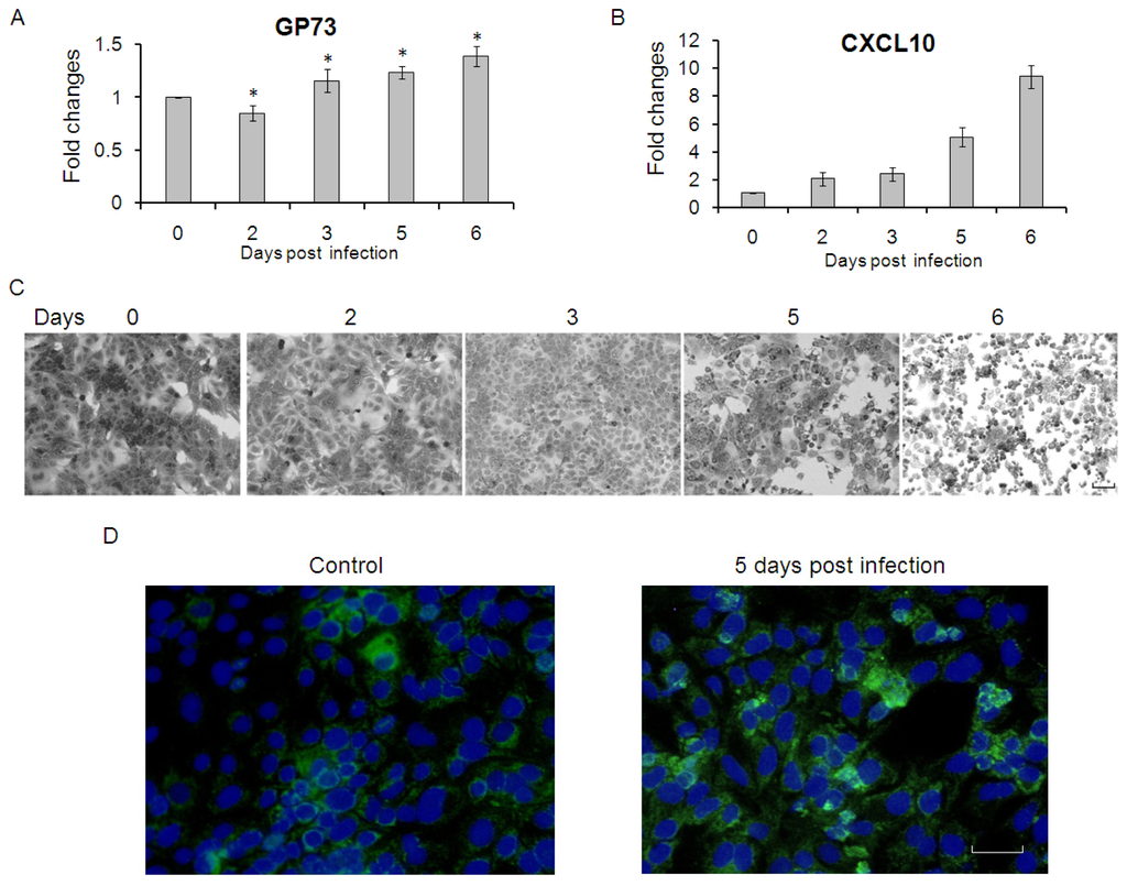 GP73 is up-regulated in Huh7.5.1 cells with cytopathic effect. (A) GP73 and CXCL10 (B) were measured by real-time RT-PCR in Huh7.5.1 cells at 0, 2, 3, 5 and 6 days after HCV infection (MOI = 10), (* p < 0.05, compared with control); (C) Crystal violet (CV) staining of Huh7.5.1 cells at 0, 2, 3, 5 and 6 days after HCV infection (MOI = 10). (Scale bar = 50 μM); and (D) Detection of GP73 protein by immunofluorescence assay. (Green for GP73; Blue for nuclei, Scale bar = 50 μM).