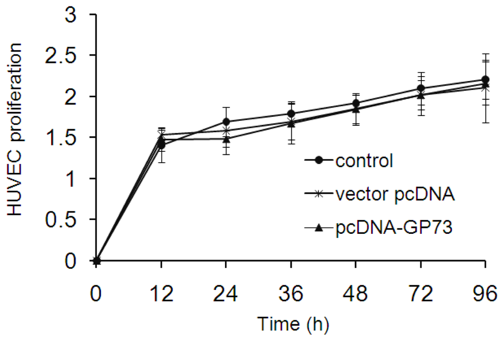 Hepatocellular carcinoma (HCC) is characterized by highly vascularized and rapid tumor progression which has been considered as the main reason for its devastating outcome. Proliferation of vascular endothelial cells plays an important role in tumor growth. Wei et al. found that GP73 may clearly prompt the proliferation of LX2 cells (hepatic stellate cell line), but without any effect on HepG2 cells in vitro [18]. Similar results, that overexpression of GP73 had no impact on HepG2 cell proliferation, were observed in our study (data not shown). To further detect if GP73 plays a role in the proliferation of vascular endothelial cells, we detected the cell proliferation in HUVEC with or without overexpression of GP73. The results showed that overexpression of GP73 had limited impact on proliferation of HUVEC cells (Figure 6).