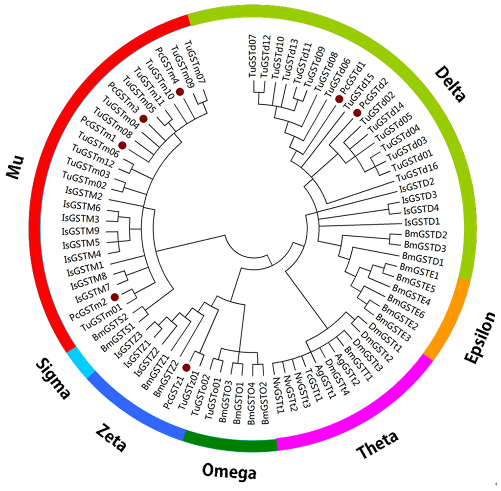 To date, all available GSTs have been classified into 13 different classes according to their sequence homology and molecular characteristics, and some GSTs are species-specific [,]. In Acari, total 35 GST genes belonging to seven classes (delta, epsilon, mu, omega, zeta, kappa and microsomal) have been found, based on analysis of the I. scapularis genome []. In addition, the genome dataset from T. urticae showed that all of the 31 cytosolic GST genes could be placed into four different classes: delta (16), mu (12), omega (2) and zeta (1) []. In this study, we only obtained seven full-length cDNAs encoding P. citri GST genes based on the transcriptome datasets, indicating that further investigation of remaining GSTs in P. citri is needed.