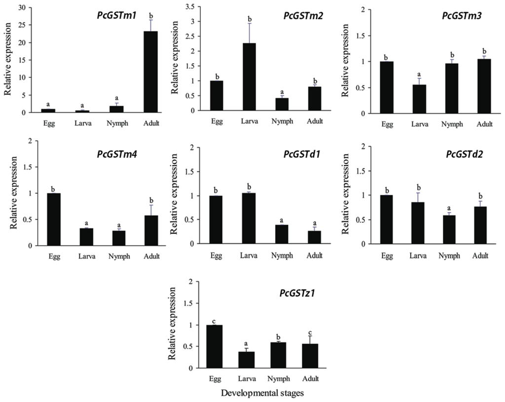 Developmental stage-specific expression patterns of seven GST genes were examined in eggs, larvae, nymph, and adults using RT-qPCR. Among these seven genes, PcGSTm1 showed significantly higher expression (23.2-fold) in adult than in other developmental stages (Figure 2). That significant 10 fold greater expression of PcGSTm1 in adult could be considered as one key factor involved in the rapid development of acaricides resistance. Additionally, a higher relative expression level of GST at the larval stage compared with the adult stage has also been found in A. gambiae []. However, similar results have not been reported in mites and ticks. Interestingly, four mu-class GST genes (PcGSTm1, PcGSTm2, PcGSTm3 and PcGSTm4) had various expression patterns in four different developmental stages. However, significantly higher relative expression in adult than in larva was found for all mu-class GSTs, other than PcGSTm2. PcGSTm3 and PcGSTm4 showed lower expression in larva than in other stages. The lowest expression for PcGSTm2 (0.4-fold) was observed in nymph. The two delta-class genes (PcGSTd1 and PcGSTd2) showed similar expression profiles in the four developmental stages and had the lowest relative expression levels in adult and nymph, respectively (Figure 2). In addition, the lowest expression level of PcGSTz1 (0.37-fold) relative to eggs was observed in the larval stage (Figure 2). In summary, all of the genes were expressed at a higher level in adults than in larva and nymph, except PcGSTd1and PcGSTd2. These results may be explained by differences in feeding rate and the various environmental challenges caused by mobility differences of P. citri during those stages.