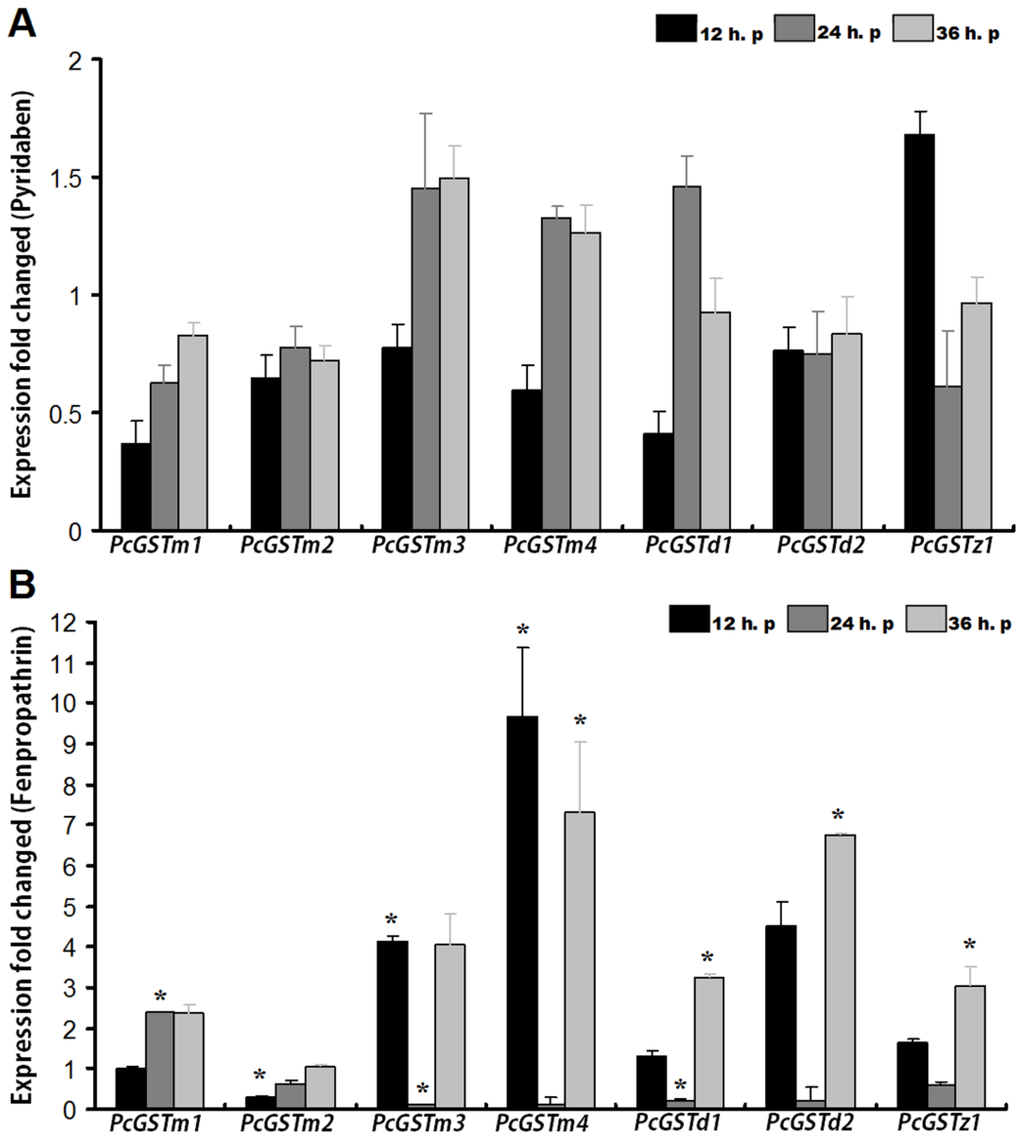 Interestingly, the relative expression levels of six GST genes (PcGSTm1, PcGSTm3, PcGSTm4, PcGSTd1, PcGSTd2 and PcGSTz1) in P. citri showed different time-dependent expression profiles when exposed to a sub-lethal concentration of fenpropathrin (Figure 3). Compared with the control, the relative expression levels of mu-class genes PcGSTm3 and PcGSTm4 were 4.1-fold and 9.6-fold higher soon after 12 h exposure to fenpropathrin. Another mu-class gene, PcGSTm1, also increased (2.4-fold) after 24 h of fenpropathrin exposure. No significantly increased relative expression level was found for PcGSTm2, suggesting its minor role in detoxification of fenpropathrin. Two delta-class GST genes, PcGSTd1 and PcGSTd2, were up-regulated 3.2-fold and 6.0-fold after 36 h of fenpropathrin treatment, respectively (Figure 3B). In addition, after 36 h of treatment with fenpropathrin, the relative expression levels of PcGSTm4 and PcGSTz1 also showed 7.3-fold and 3.0-fold increases, respectively.