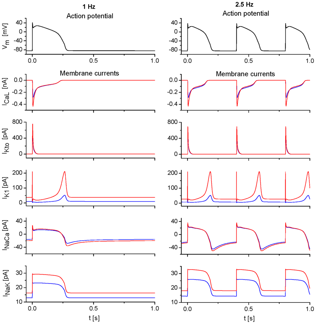 Action potentials (Vm) and selected membrane currents (ICaL, IKto, IK1, INaCa, INaK) at steady-state under 1 Hz (left panel) and 2.5 Hz (right panel) stimulation. Blue and red continuous lines refer to surface and t-tubular membrane, respectively.