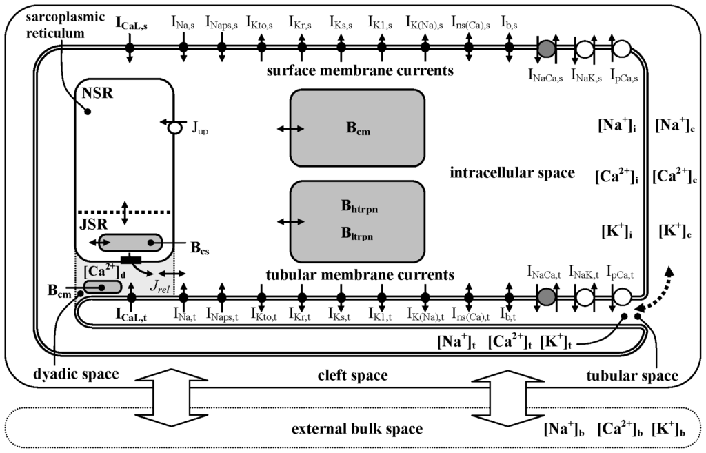 The present model of human ventricular myocyte has been formulated to take into account the up-to-date knowledge of membrane ionic currents and intracellular homeostasis in human cells. The description of the t-tubular system is based on current knowledge of morphological features in human cardiomyocytes []. To increase the accuracy of the model, the concentration changes in the layer adjacent to the tubular membrane were introduced similarly as in our latest work []. The t-tubular space was partitioned into concentric subspaces to describe the radial concentration gradients within the t-tubular lumen. In addition, to be consistent with the presence of the limited size of the pericellular interstitial space, a cleft space has been formulated, as done by Nygren et al. [].