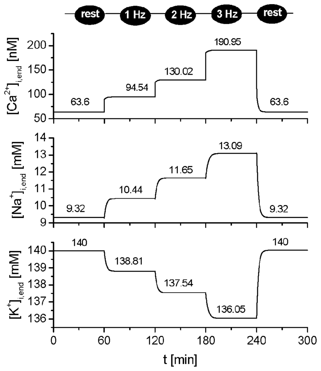 The stability of the model showing cytoplasmic end-diastolic [Ca2+] (top), [Na+] (middle) and [K+] (bottom) during a 5-h cell lifetime run during which the model cell was initially at rest and then stimulated at 1, 2 and 3 Hz and returned to rest for one hour, as indicated on the top of the panel.