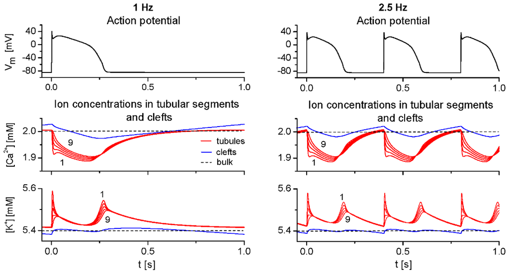 Action potentials (Vm) and ion concentrations ([Ca2+], [K+]) in the first, third, fifth, seventh and ninth segments of tubular lumen (red lines) and in cleft space (blue lines) at 1 Hz (left panel) and 2.5 Hz (right panel) steady-state stimulation. Horizontal dashed lines show the levels of ion concentrations in the external bulk space.