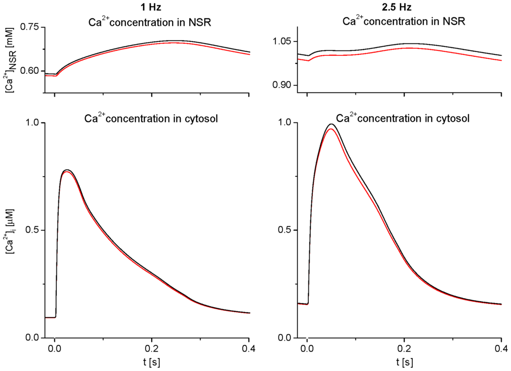 Effect of Ca2+ and K+ concentration changes in the first t-tubular segment and cleft space on Ca2+ concentration in the network compartment of SR ([Ca2+]NSR) and Ca2+-transient in the cytosol ([Ca2+]i) during a steady-state stimulation at 1 Hz (left panel) and 2.5 Hz (right panel). The results hold for basic adjustment of tubular fractions of Ca2+ transporters in the model cell (fCaL,t = 0.64, fNaCa,t = 0.56, and fpCa,t = 0.2). The model was run when ion concentration changes in extracellular spaces were either allowed to change (red lines) or fixed at external bulk levels (black lines).