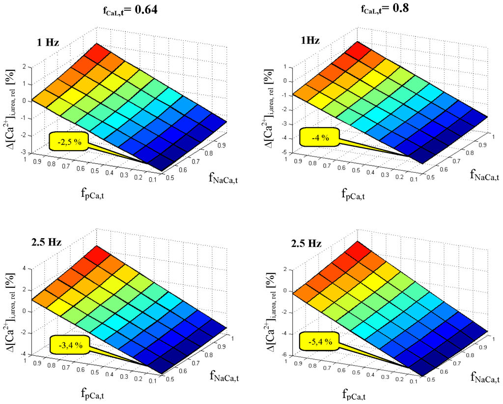 Effect of values of fpCa,t and fNaCa,t on intracellular Ca2+-transient during a steady-state cycle at fCaL,t of 0.64 (left panels) and 0.8 (right panels). The upper and bottom panels, respectively, show the results obtained at stimulation frequency of 1 and 2.5 Hz. The values in the yellow bubble indicate the percentage of the reduction of the cytosolic Ca2+-transient for basic adjustment of fNaCa,t and fpCa,t (0.56 and 0.2, respectively). Δ[Ca2+]i,area,rel represents the percentage change of the area delimited by cytosolic Ca2+-transient during a whole cycle relative to the area of steady-state Ca2+-transient in the model with extracellular ion concentrations fixed at external bulk levels.