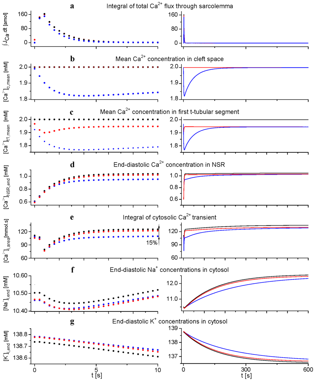 Figure 5 shows the responses of the model to a sudden change of stimulation frequency from 1 to 2.5 Hz followed during 10 s (left panels) and 600 s (right panels). It demonstrates the potency of ion concentration changes in both extracellular spaces to modulate NSR Ca2+ load and intracellular [Ca2+], [Na+] and [K+] during transient events after a sudden change of stimulation frequency. The results from the basic model (blue dots) are compared with the results after fixing ion concentrations in the cleft space (red dots) or in both t-tubular and cleft spaces (black dots) at external bulk levels. The right panels illustrate progression toward the steady state in an expanded time scale.
