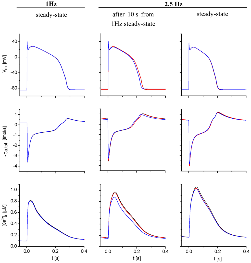 The effect of ion concentration changes in extracellular spaces on the action potential (AP) (Vm), total sarcolemmal Ca2+ flux (JCa,tot) and cytosolic Ca2+-transient after a sudden increase of stimulation frequency from 1 to 2.5 Hz. The left, middle and right columns show the results obtained, respectively, at 1 Hz steady-state stimulation, at 10 and at 600 s (steady state) after a sudden increase of simulation rate to 2.5 Hz. The model was run when t-tubular and cleft ion concentrations were allowed to change (blue lines), when ion concentrations in the cleft space were fixed (red lines) and when both t-tubular and cleft ion concentrations were fixed at external bulk levels (black, practically identical to red traces).