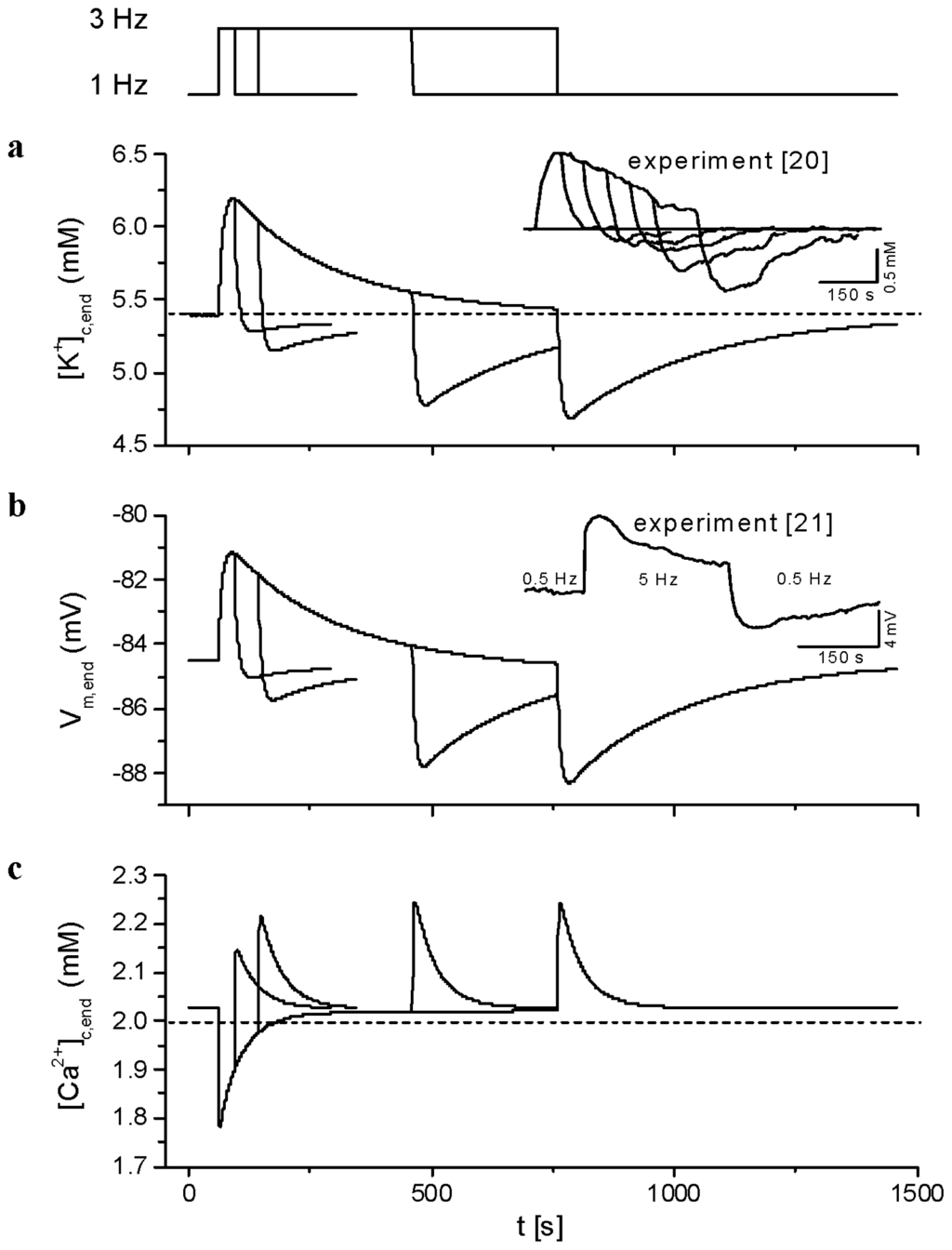 Accumulation-depletion phenomena during and after a high frequency train of stimulations. From a period of stimulation at 1 Hz, a train of stimuli at 3 Hz has been applied for four different durations: 34, 144, 400 and 700 s. From up to down are plotted superimposed outputs of the model for the four durations: the timing of changes in the frequency of stimulation, the time course of changes in the end-diastolic values of cleft K+ concentration (a), membrane voltage (b) and cleft Ca2+ concentration (c). The horizontal dashed lines show the levels of corresponding ion concentrations in external bulk solution. The insets show the corresponding experimental records digitized from Kunze [] and Attwell et al. [].