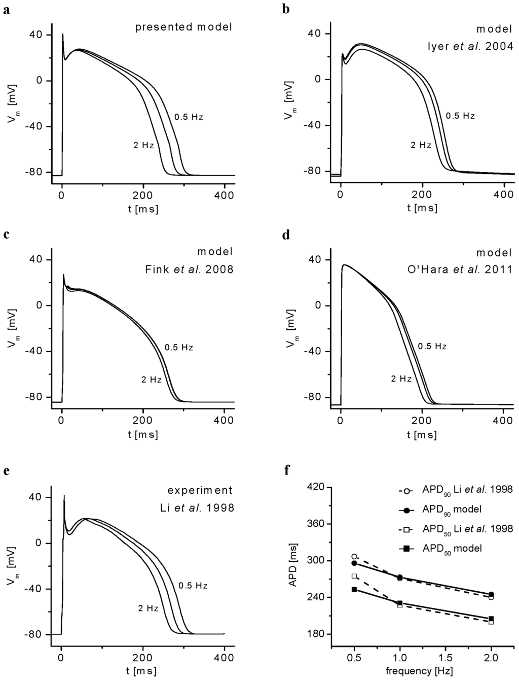 Comparison of model reconstructions of steady-state AP waveforms recorded at 0.5, 1 and 2 Hz stimulation in a human subepicardial cell by Li et al. []. The following models were used: (a) the present model; (b) the model of Iyer et al. []; (c) the model of Fink et al. [] and (d) the model of O’Hara et al. []; (e) Representative AP waveforms digitized from Li et al. []; and (f) Comparison of values of APD50 and APD90 (action potential duration at 50% and 90% repolarization, respectively) at 0.5, 1 and 2 Hz obtained from the experimental data of Li et al. [] and the present model. In the models, 15 APs were elicited at each stimulation rate, as done in [].