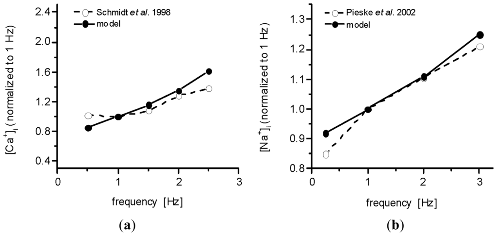 Comparison of normalized data showing the frequency-dependent increase of intracellular diastolic ion concentrations in the present model and in the experimental studies. (a) [Ca2+]i (100 APs elicited at each stimulation rate); data published by Schmidt et al. []; and (b) [Na2+]i (600 APs elicited at each stimulation rate); data published by Pieske et al. [].
