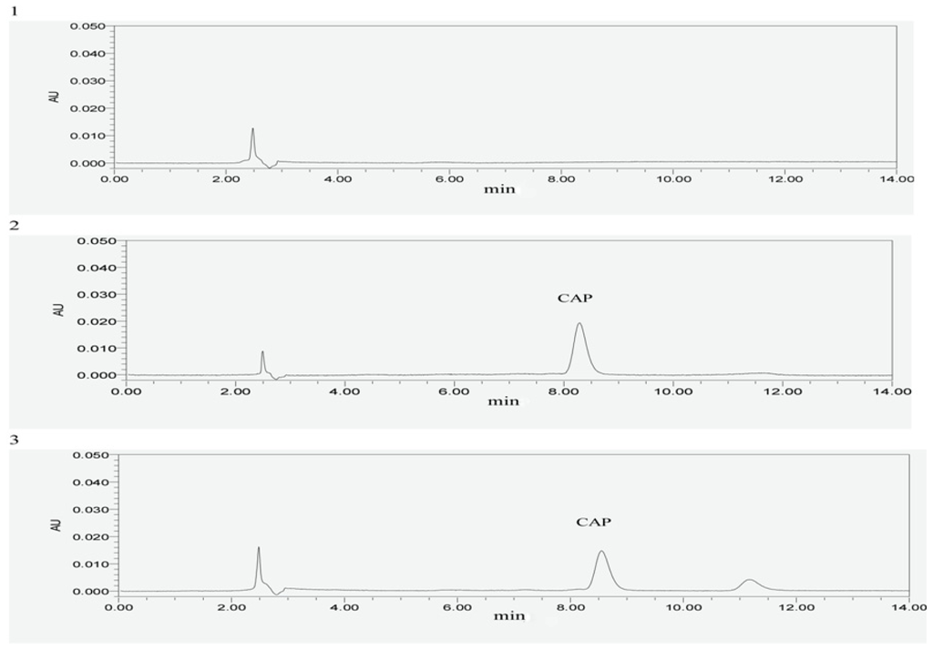 Linear relationships could be determined from peak area (Y) and concentration (X): Y = 8386.8X − 3304.6, r = 0.9993. The linear range was 1.81–28.88 μg/mL, which reflected the linear relationship perfectly. CTS, excipients and solvents did not interfere with CAP determination. The relative standard deviations of precision, stability, and recovery experiments were 1.60%, 0.42% and 1.15%, respectively. The average recovery in the recovery experiments was 99.42%. Furthermore, it was revealed from stability experiments that CAP was stable over 24 h. Table 2 shows the results of the recovery experiments. Figure 2 shows the HPLC chromatogram of specificity investigation. The relative standard deviations of precision, stability, and recovery experiments meted with International Conference on Harmonisation of Technical Requirements for Registration of Pharmaceuticals for Human Use (ICH) and Pharmacopoeia Commission of People’s Republic of China (Ch.P.) recommended values.