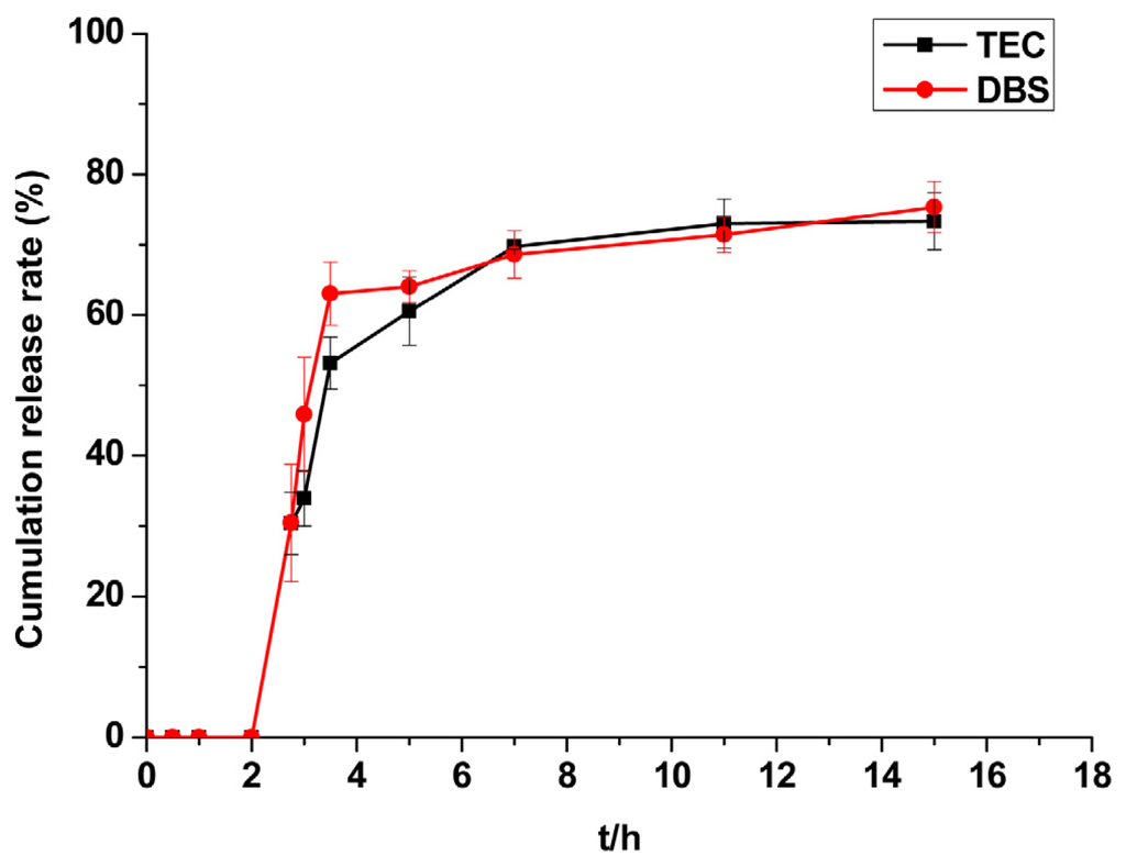 Plasticisers are used to increase the plasticity of highly polymeric materials. They can weaken the Van der Waals forces between polymer chains, increasing mobility and reducing crystallinity. When plasticisers are inserted into polymer chains, the plasticity of the coating material increases and enables even coating. TEC (triethyl citrate) and DBS (dibutyl sebacate) are two common plasticisers used in the preparation of enteric coated tablets. Figure 4 shows the effects of different plasticisers to the release properties of the enteric coated tablets. TEC and DBS had similar effects on the release of CAP. TEC is less expensive than DBS, reducing the cost of industrial production. This makes TEC more suitable as a plasticiser for enteric coated tablets.