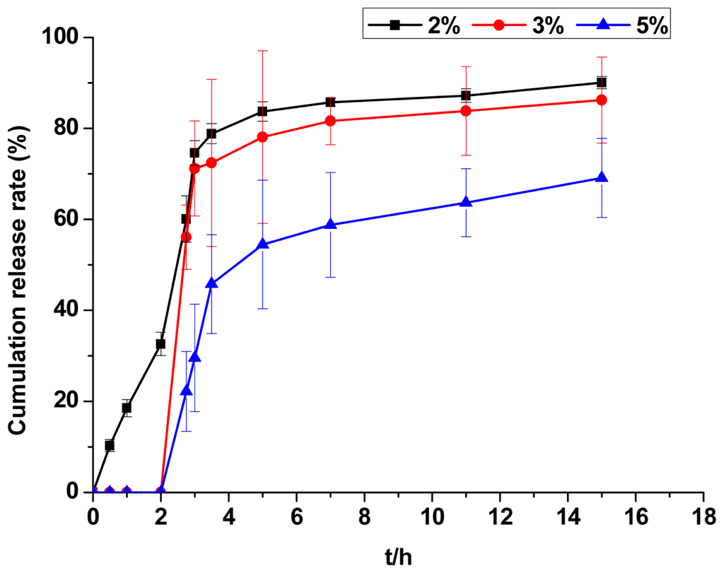 The drug release behaviours observed with different coating weights in pH 6.8 phosphate buffer solution are shown in Figure 6. It is readily apparent that CAP release was slow and incomplete for the coating weight of 5%. This formulation is unable to release the required therapeutic dose because of the unsuccessful solution of thick film in the intestinal fluid. When the coating weight was 2%, the CCMS enteric coated tablets were not completely coated. These tablets also showed swelling phenomena due to erosion by hydrochloric acid solution. Ultimately, these enteric coated tablets failed altogether. A coating weight of 3% led to a more reasonable drug release curve for CAP. Film formation at this coating weight was also excellent which had no coating film breakage. A coating weight of 3% was therefore determined to be the optimal ratio.