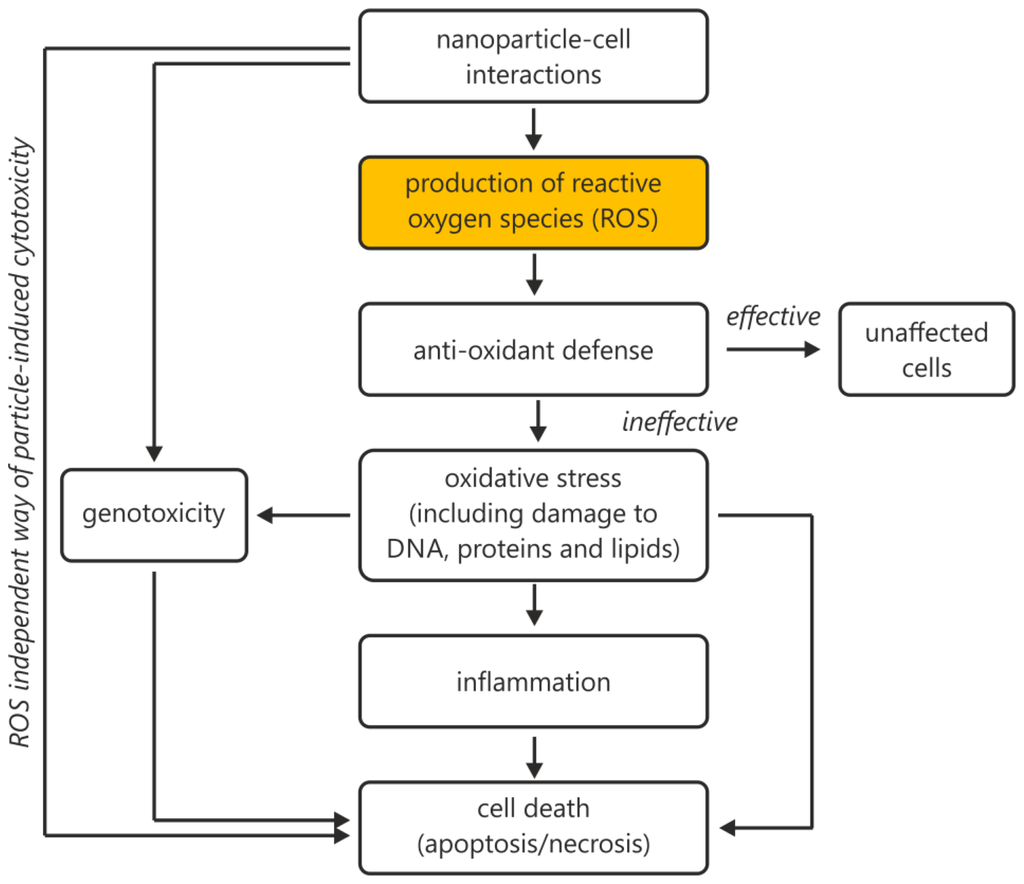 Activated transcription factor NFκB stimulates the production of inflammatory cytokines (e.g., tumor necrosis factor alpha (TNF-α), interleukin (IL-x)). The release of cytokines has the potential to cause inflammation under in vivo conditions and can ultimately promote the development of diseases (fibrosis, cancer, apoptosis, and necrosis) []. The formation of free radicals at the surface of NPs or by metallic ions is according to Donaldson et al. responsible for damaging supercoiled DNA []. Thus an increased level of ROS can be directly genotoxic. Furthermore, it has been reported that higher levels of released ROS lead to cellular constituents, such as membranes, proteins, lipids etc., being attacked.