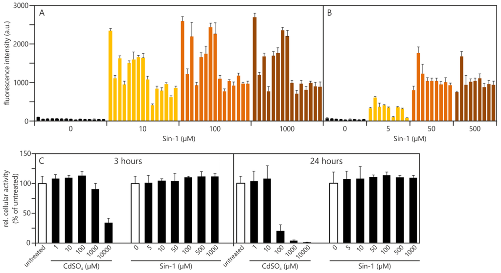 Absolute values for detecting reactive oxygen species (ROS): After one hour of H2DCF-DA loading, A549 cells were treated for three hours with different concentrations of Sin-1. Arbitrary fluorescence values after blank subtraction are shown. Each bar represents the mean of three technical replicates of an independent experiment and corresponding standard deviations. (A) 15 independent experiments using 10, 100 and 1000 μM Sin-1; (B) Nine additional independent experiments using reduced Sin-1 concentrations (5, 50, 500 μM); (C) Sin-1 concentrations used show no sign of toxicity in A549 cells. Cells were treated for three and 24 hours with the indicated Sin-1 concentrations. CdSO4 served as the chemical reaction control at both time points and induced dose- and time-dependent cytotoxicity.