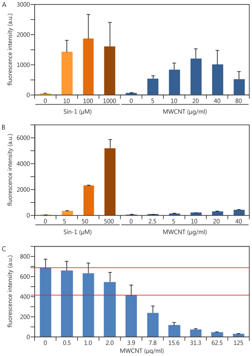 Sin-1 was also able to process H2DCF in a cell-free environment and, as such, proved to be useful as a chemical reaction control in this setting. Nevertheless, and according to the cellular setup, this is only true in a qualitative manner because the absolute fluorescence values varied similarly (data not shown). As no cells were involved and hence cell death could not limit Sin-1 activity, we observe a dose-response relationship. MWCNTs themselves only marginally process the H2DCF molecule (Figure 4B).