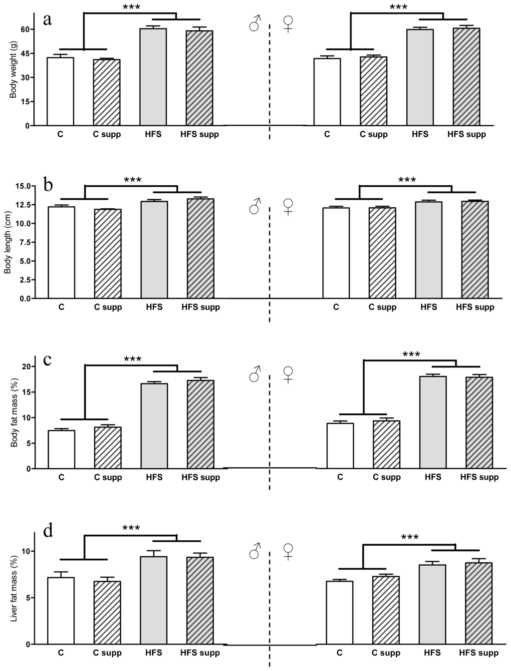 Body weight (a); length (b); body fat mass (c) and liver fat mass (d) from male and female offspring depending on maternal nutrition during lactation. Data are reported as means ± SE (n between 6 to 8 from each experimental group). C, control; C supp, control supplemented; HFS, high-fat-sucrose; HFS supp, high-fat-sucrose supplemented; ***p < 0.001.