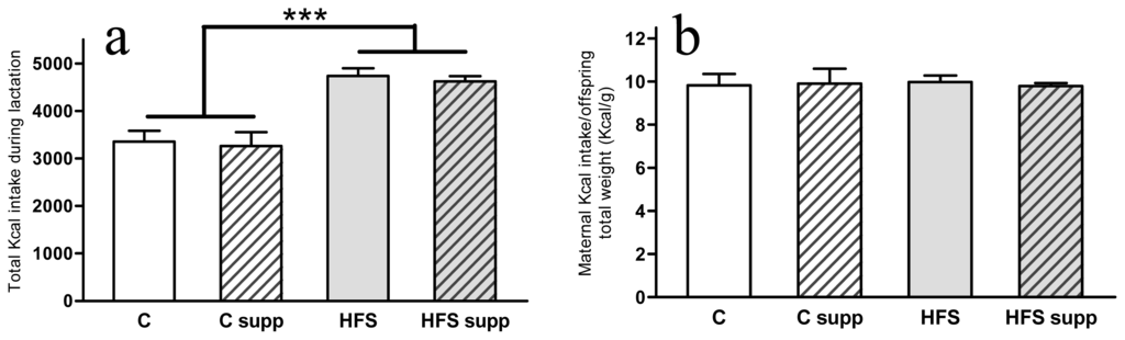 Maternal energy intake during lactation (a) and energy consumption per offspring weight (b). Data are reported as means ± SE (n = 8 from each experimental group). C, control; C supp, control supplemented; HFS, high-fat-sucrose; HFS supp, high-fat-sucrose supplemented; ***p < 0.001.
