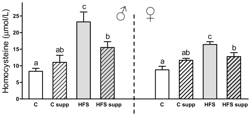 Homocysteine plasma concentration from male and female offspring depending on maternal nutrition during lactation. Data are reported as means ± SE (n between 6 to 8 from each experimental group). C, control; C supp, control supplemented; HFS, high-fat-sucrose; HFS supp, high-fat-sucrose supplemented; different letters indicate differences between groups of at least 0.05.