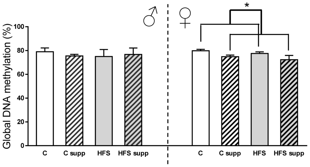 Hepatic global DNA methylation from male and female offspring depending on maternal nutrition during lactation. Data are reported as means ± SE (n = 6 from each experimental group). C, control; C supp, control supplemented; HFS, high-fat-sucrose; HFS supp, high-fat-sucrose supplemented; *p < 0.05.