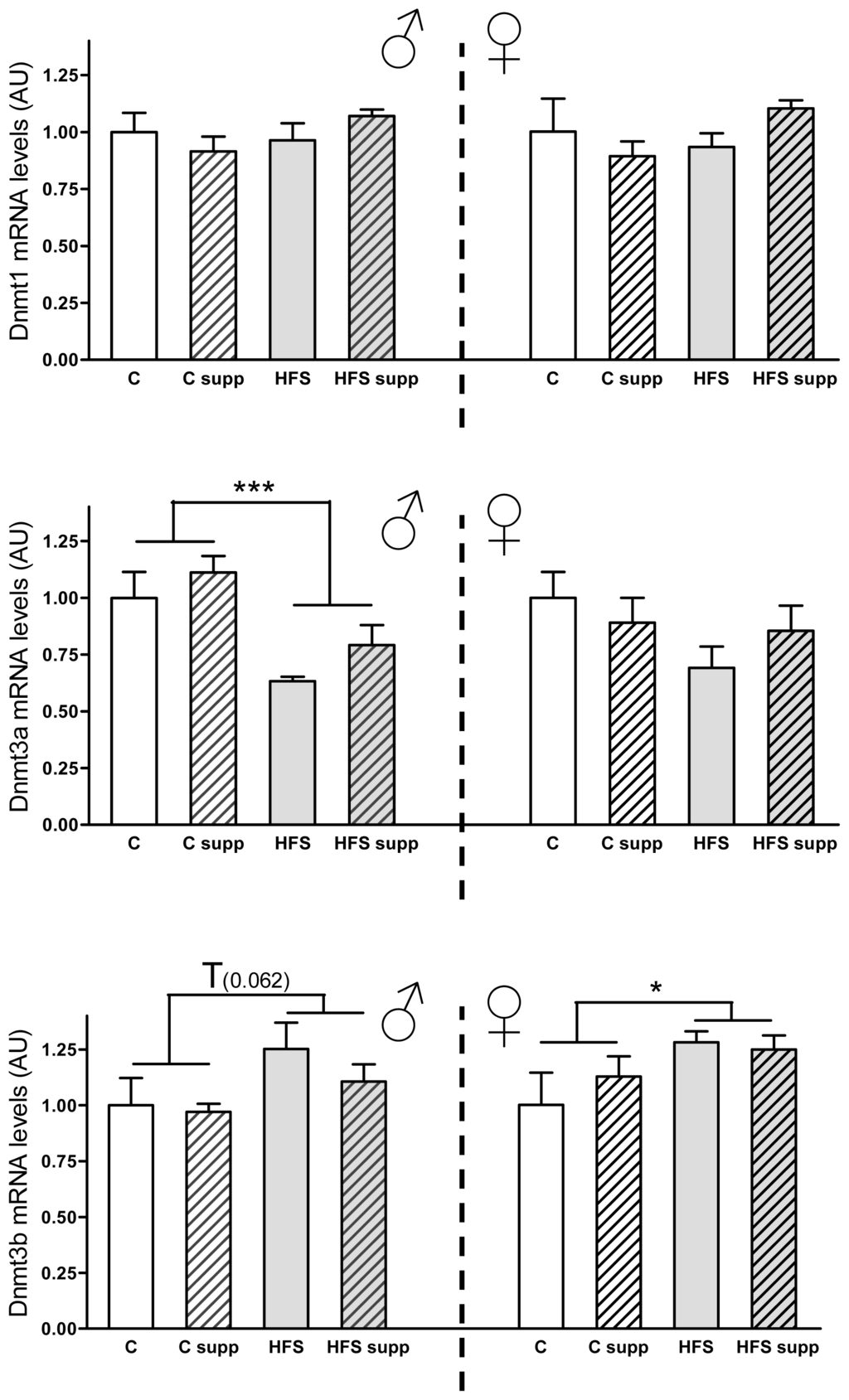 Liver mRNA levels from DNA methyltransferases from male and female offspring depending on maternal nutrition during lactation. Data are reported as means ± SE (n = 6 from each experimental group). C, control; C supp, control supplemented; HFS, high-fat-sucrose; HFS supp, high-fat-sucrose supplemented; T, p < 0.1; *p < 0.05; ***p < 0.001; AU, Arbitrary Units.